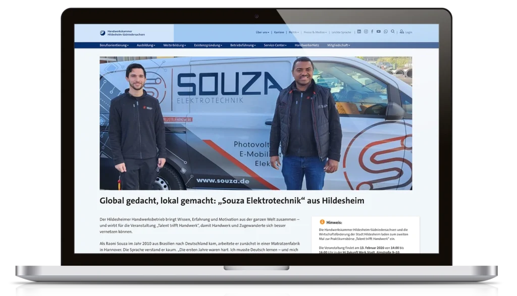 Die Handwerkskammer Hildesheim-Südniedersachsen hat Souza Elektrotechnik als Beispiel für modernes Handwerk porträtiert: klare Abläufe, starke Motivation im Team und ein Anspruch, der sich auf der Baustelle zeigt – sauber, strukturiert und kundenorientiert.